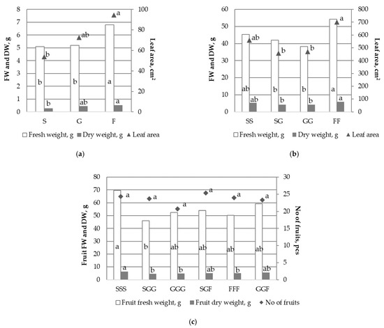 Growth and yield parameters of tomato, illuminated with different light spectrum during growth stages: (a) plant growth parameters during seedling stage; (b) plant growth parameters during growth stage; (c) fruit yield obtained in fruiting stage. Different letters indicate statistically significant differences between means according to Fisher’s test at the confidence level p = 0.05. S, G and F—lighting spectrum, selected for “seedling”, “growth” and “fruiting” stages respectively and alternated in seedling (S, G, F), biomass growth (SS, SG, GG, FF) and fruiting (SSS, SGG, GGG, GGF, FFF, SGF) tomato growth stages.