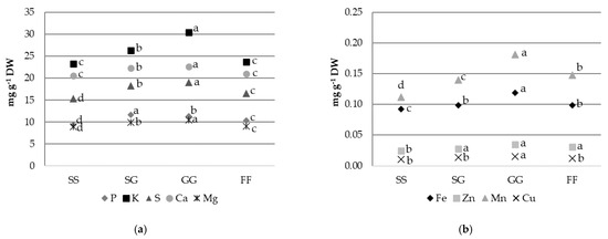 Mineral element contents in tomato leaves were evaluated in the growth stage (Figure 3). Similar variation was determined for all macro (Figure 2a) and micro (Figure 2b) elements. Green light in G spectrum resulted in the highest mineral accumulation in SG and GG illuminated plants. The contents of all minerals in the GG treatment, where tomato plants in seedling and growth stages were cultivated under green light, supplementing red and blue spectrum were 1.2–1.6 times higher, compared to SS. K and Mg variation were the most pronounced.