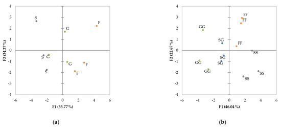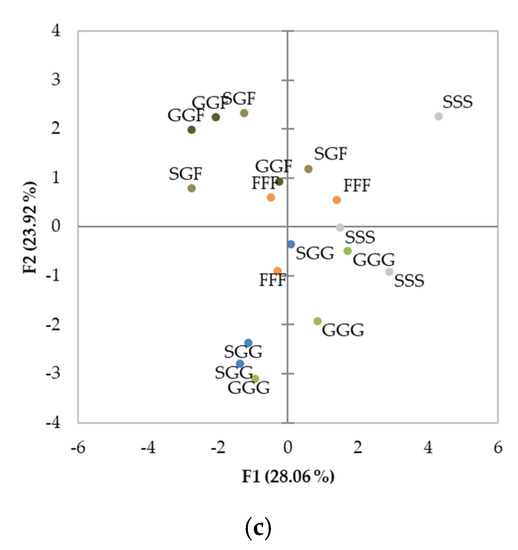 The PCA scatterplots, indicating distinct differences in photosynthetic performance of tomato, cultivated under different lighting spectrums during different growth stages: (a) seedling; (b) growth; (c) fruiting. S, G and F—lighting spectrum, selected for “seedling”, “growth” and “fruiting” stages respectively and alternated in seedling (S, G, F), biomass growth (SS, SG, GG, FF) and fruiting (SSS, SGG, GGG, GGF, FFF, SGF) tomato growth stages.