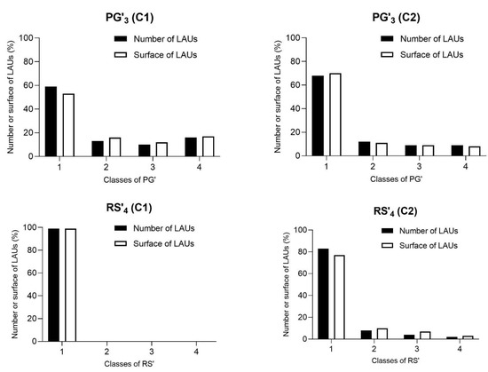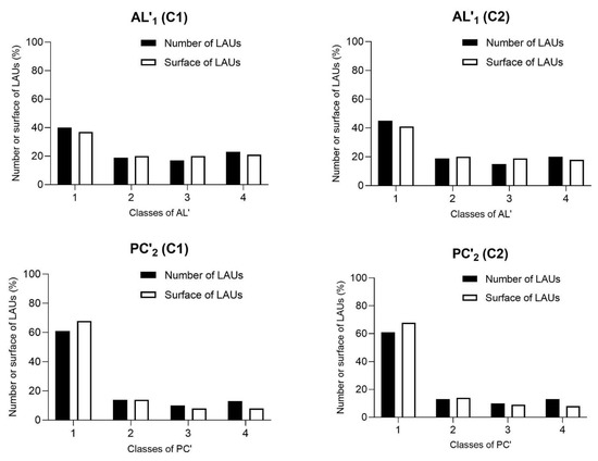 The pattern of LAU number was substantially similar between the two census periods (C1 and C2) but rather different between the two indicator typologies (LUI and LCC). The LCCs (Figure 5) had a high decrease of LAU number passing from the 1st class (0–25% of UAA) to the 2nd class (25–50% of the UAA). The differences among the other classes were negligible and sometimes a slight increase can be observed for the 4th class (75–100% of the UAA). Generally, these trends were more evident for the RS’ (99.7% in the 1st class for C1) and less pronounced for the AL’ (41%, 19%, 17% and 23% of total LAU’s number still in C1).