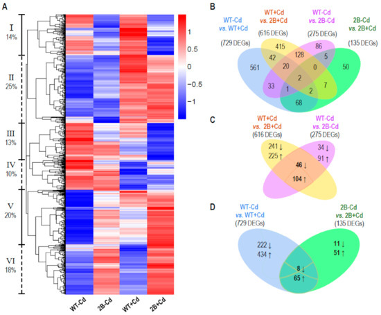 Expression profiling on rice altered by 2B expression and/or Cd treatment. (A) Heat map shows a one-dimensional hierarchical cluster analysis of 1420 DEGs (differentially expressed genes). Clusters I to VI produced according to the lg (FPKM + 1) values, % of total shown. (B) Venn diagram shows four comparison groups. (C) Comparison of WT + Cd vs. 2B + Cd and WT − Cd vs. 2B − Cd. (D) Comparison of WT − Cd vs. WT + Cd and 2B − Cd vs. 2B + Cd. Number of genes in each partition with up or down arrows indicates up- or down-regulation, respectively.