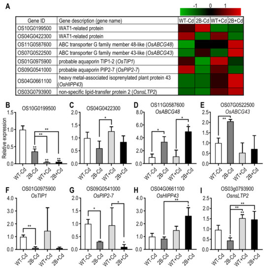 Since numerous studies have identified transporter genes to be involved in Cd accumulation, including OsNramp5, OsHMA3, OsLCT1, OsLCD, CAL1 and OsCd1 [16,17,18,19,20,31,32], we were particularly entertained by the possibility that the low Cd accumulation in 2B plants might be due to DEGs in metal ion transport. Based on this consideration, eight DEGs potentially involved in substrate transport were selected, including WAT1 (Walls Are Thin 1)-related genes OS10G0199500 and OS04G0422300, ABCG (ABC transporter G family) genes OS11G0587600 (OsABCG48) and OS07G0522500 (OsABCG43), probable aquaporin genes OS01G0975900 (OsTIP1) and OS09G0541000 (OsPIP2–7), a HIPP (Heavy metal-associated Isoprenylated Plant Protein) gene OS04G0661100 (OsHIPP43) and an nsLTP(non-specific Lipid-Transfer Protein) gene OS03G0793900 (OsnsLTP2) (Figure 2A). According to Gene Ontology (http://www.geneontology.org), WAT1 and ABCG genes encode drug/metabolite transporters. The aquaporin genes also have probable transporter activities, OsHIPP43 encodes a heavy metal-associated domain that might function in metal ion transport and OsnsLTP2 has been speculated to have ion transmembrane transporter activity. To verify the RNA-seq results (Figure 2A), qRT-PCR was conducted on these eight genes (Figure 2B–I). However, the qRT-PCR data could not confirm that expression of OS10G0199500 (WAT1-related gene) was higher in 2B than in WT without Cd treatment (Figure 2A,B), and they failed to detect differential expression of OS07G0522500 (OsABCG43) between WT and 2B under Cd stress (Figure 2A,E). For OS04G0422300, a statistically significant difference was found only between 2B − Cd and WT + Cd (Figure 2C). Aside from these three, the expressions of the other five genes were confirmed by qRT-PCR and were advanced for further analysis.