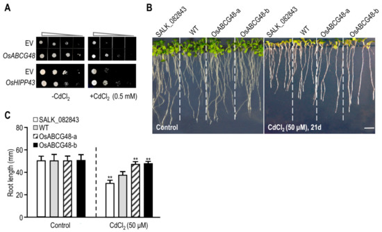 Since the production of the OsO3L2 protein and its truncated 2B peptide is known to enhance oxidative stress tolerance in S. pombe [21], we cloned these five genes into vector pART1 and transformed it into fission yeast. Enhanced Cd tolerance was observed only for OS04G0661100 (OsHIPP43) and OS11G0587600 (OsABCG48) (Figure 3A). We next tested whether OsHIPP43 and OsABCG48 could enhance Cd tolerance in Arabidopsis. Each gene was expressed from the strong mannopine synthase-derived promoter Superpro, and after Agrobacterium-mediated transformation, six OsHIPP43- and nine OsABCG48-expressing lines were obtained. Two randomly chosen lines of each were tested on a range of CdCl2 concentrations (0 μM, 25 μM, 50 μM, 75 μM and 100 μM). Although T3 homozygous seedlings of two OsHIPP43-transformed lines showed OsHIPP43 expression (Figure S1A), they did not show enhanced tolerance to Cd. For the two OsABCG48 expression lines, OsABCG48-a and OsABCG48-b, they grew about 22% to 23% longer roots than the WT control in 50 μM of Cd, but statistically significant differences were not observed with lower or higher Cd concentrations (Figure 3B,C). We also tested a knockout line (SALK_082843) of AtABCG34, the most closely related OsABCG48 ortholog in Arabidopsis (Figure S2). The two OsABCG48 expression lines grew 44% to 45% longer roots than the Atabcg34 knockout line (Figure 3B,C). qRT-PCR verified that this mutant lacked AtABCG34 expression, while detectable OsABCG48 transcription was found in the OsABCG48 expression lines (Figure S1B–D). Since the manganese transporter Nramp5 in rice can mediate Cd transport [16], and HIPPs can lower the kinetic barrier for Cu transfer [33,34], we also tested Mn and Cu tolerance. However, no significant difference was found between the WT and the OsABCG48-expressing line (Figure S3). This indicates that OsABCG48 specifically confers tolerance to Cd and not to Cu or Mn.