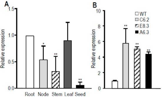 Expression of OsABCG48 in rice normalized to OsActin-1. (A) Field-grown WT rice two weeks after flowering. (B) Seven-day-old T2 seedlings from OsABCG48-transformed lines C6.2, E8.3 and A6.3. Data (bar and error bar) are shown as mean ± SD (n = 3); statistical analysis by unpaired Student’s t-test compared to WT (* p < 0.05, ** p < 0.01).