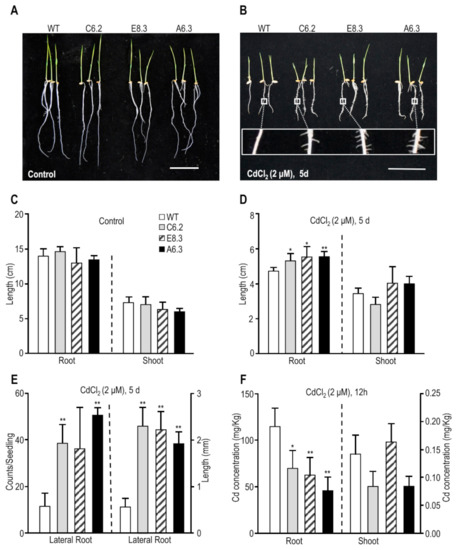 Using the same Arabidopsis expression constructs, we conducted Agrobacterium-mediated transformation on eight embryogenetic rice calluses (Table S6). Multiple T0 plants were regenerated from each callus. Of the T0 plants derived from the six calluses that produced seeds, 7 out of 16 T0 plants (A5, C4, C8, F2, F7, G1 and G6) were likely to be single-locus based on resistance to sensitive segregation data from germination on hygromycin-containing plates. In the sampling of 88 out of 359 hygromycin-resistant clones, 74% were PCR-positive for the Superpro–OsABCG48 junction (Table S6). These seven lines were preserved to produce homozygous T3 and T4 seeds for testing of grain Cd. However, for the other T0 plants deemed to harbor multiple OsABCG48 loci, we could afford to use them to test the effect from overexpression of OsABCG48. T2 seedlings from three multi-loci lines (A6.3, C6.2 and E8.3) were found to show ~5-fold higher expression of OsABCG48 than WT plants (Figure 4B). While these T2 seedlings did not show a difference in primary root and shoot lengths in the absence of Cd, the presence of Cd reduced primary root and shoot lengths by about half in both WT and OsABCG48 overexpression lines, but the primary root lengths of three overexpressing lines were 12% to 17% longer than WT after a 5-day treatment with 2 μM CdCl2 (Figure 5A–D). Aside from the primary root length, differences were also found on lateral roots, especially on those developed from the primary root as each of the three overexpressing lines grew three- to four-fold more and longer lateral roots than the WT when treated with Cd (Figure 5B,E). It is possible that more and longer lateral roots in the OsABCG48 overexpression plants had compensated for the Cd-repressed growth of primary roots and hence contributed to Cd tolerance.