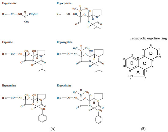 - Arroyo-Manzanares, N.; Gámiz-Gracia, L.; García-Campaña, A.M.; di Mavungu, J.D.; de Saeger, S. Ergot alkaloids: Chemistry, biosynthesis, bioactivity, and methods of analysis. In Fungal Metabolites, Reference Series in Phytochemistry; Mérillon, J.M., Ramawat, K., Eds.; Springer: Berlin/Heidelberg, Germany, 2017; pp. 887–929. [Google Scholar]