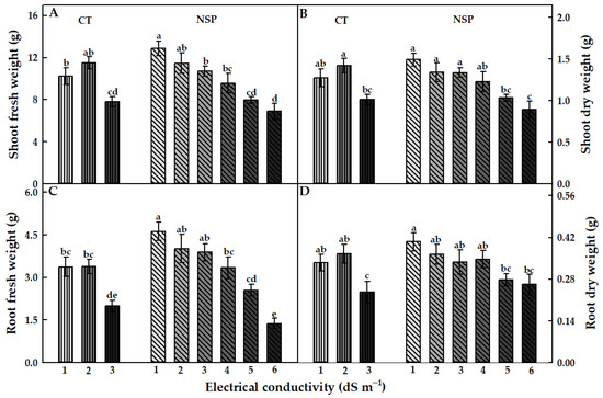 Fresh and dry weights of the shoot (A,B) and root (C,D) of red perilla plants grown under various EC levels of greenhouse nutrient solution (CT) and newly-developed nutrient solution for red perilla (NSP) after 7 weeks of transplanting. Different letters indicate significant difference at p < 0.05 (n = 9).