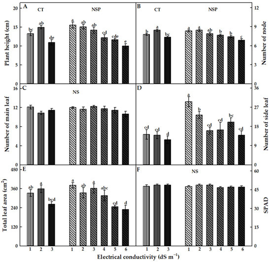 The EC levels of CT and NSP had different effects on the growth characteristics of red perilla. Overall, the EC levels at 1 and 2 dS m−1 of CT and 1–3 dS m−1 of NSP showed an efficient effect on red perilla growth. Compared to CT, NSP 1 dS m−1 enhanced the higher fresh and dry weights of shoots and roots, although there were no statistically significant differences in shoot and root dry weights observed between NSP 1 dS m−1 and CT 1, 2 dS m−1 (Figure 2). Shoot fresh weight of plants grown under NSP 1 and 2 dS m−1 was significantly higher than those under NSP 5 and 6 dS m−1 (Figure 2A); whereas shoot dry weight was greater under NSP 1–4 dS m−1 compared with that of plants grown under NSP 6 dS m−1 (Figure 2B). Meanwhile, root fresh and dry weights in NSP 1 dS m−1 were 3.4 and 1.5 times, respectively, higher than those in NSP 6 dS m−1 (Figure 2C,D). Plants grown under NSP 1–3 dS m−1 had a significantly higher plant height than those grown under NSP 4–6 dS m−1 (Figure 3A), and the node number was greater under NSP 1–5 dS m−1 compared to 6 dS m−1 (Figure 3B). There was no significant difference in the number of main leaves between CT and NSP (Figure 3C), but interestingly, NSP 1 dS m−1 markedly increased side leaves number by approximately two times than CT and other NSP treatments (except for NSP 2 and 5 dS m−1). The total leaf area of plants under NSP 5 and 6 dS m−1 was considerably lower than those under CT (1 and 2 dS m−1) and NSP (1, 2, and 3 dS m−1) (Figure 3E), whereas SPAD values were similar among the treatments (Figure 3F). Generally, the higher EC levels of CT (3 dS m−1) and NSP (5 and 6 dS m−1) inhibited the growth of red perilla, and most of the growth characteristics were similar among CT 1, 2 dS m−1 and NSP 1, 2, and 3 dS m−1. The principal component analysis (PCA) showed the comparison of correlations among growth parameters of red perilla grown in NSP (Figure 4). The first component (Dim1) explained 69.3% of the total variables, while the second component explains 10.3% of those. The narrow angles inside the circle showed strongly positive correlations among the growth parameters (Figure 4A), and in the scatter plot, plants grown in NSP 1 dS m−1 (NSP1) was not significantly different from NSP 2 dS m−1, which was most distinct to NSP 5 and 6 dS m−1 (NSP5 and NSP6) (Figure 4B).
