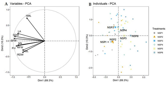 Principal component analysis (PCA) showing the effects of EC levels (1–6 dS m−1) of newly-developed nutrient solution for red perilla (NSP) on the plant growth characteristics. (A): the correlation circle of variables (SFW: shoot fresh weight, SDW: shoot dry weight, RFW: root fresh weight, RDW: root dry weight, PH: plant height, NN: number of nodes, NML: number of main leaves, NSL: number of side leaves, LA: leaf area); (B): the scatter plot of individuals (EC levels of NSP 1–6 dS m−1).