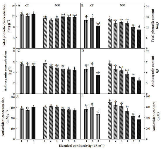 Total phenolic, total anthocyanin, and antioxidant concentration (A,C,E) and content (B,D,F) of red perilla plants grown under various EC levels of greenhouse nutrient solution (CT) and the newly-developed nutrient solution for red perilla (NSP) after 7 weeks of transplanting. Different letters indicate significant difference at p < 0.05 (n = 9).