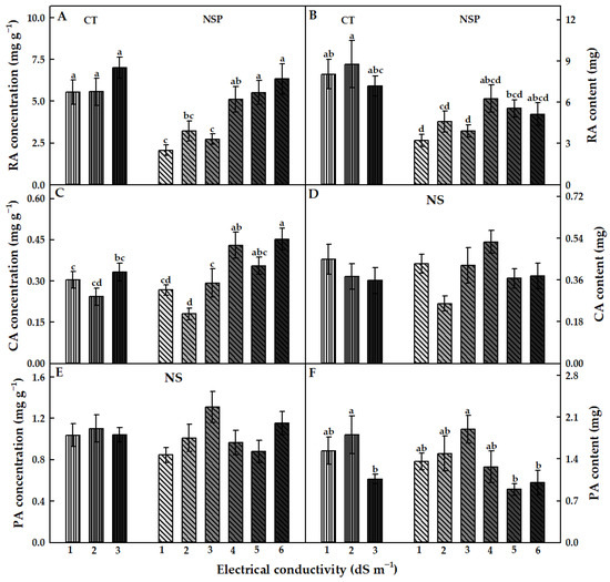 The EC levels of the CT and NSP had different effects on RA, CA, and PA accumulations in red perilla (Figure 6). RA concentration and content tended to increase as the EC levels of both nutrient solutions increased (Figure 6A,B). These values were no significant differences among CT treatments. In NSP, the RA concentration in NSP 5 and 6 dS m−1 was considerably higher than that in NSP 1–3 dS m−1, and no statistical difference in RA content was obtained. In particular, RA concentration under CT 1, 2, and 3 dS m−1 were 2.7-, 1.7-, and 2.6 times, respectively, higher than those under NSP 1, 2, and 3 dS m−1, and CT 1, 2, and 3 dS m−1 plants had 2.5-, 1.9-, and 1.8 times higher RA content compared to NSP 1, 2, and 3 dS m−1, respectively. CA concentration showed a similar trend to that of RA. There was no significant difference in this concentration among CT treatments. CA concentration in NSP 1–3 dS m−1 was slightly lower than that in CT, but the respective EC levels of CT and NSP solutions showed no statistically significant difference in this value (Figure 6C). Increasing EC levels of NSP resulted in higher CA concentration and reached the highest value at 4 and 6 dS m−1. However, CA content was not significantly different among the EC levels of both nutrient solutions (Figure 6D). There were no observable differences in PA concentration among treatments (Figure 6E). PA content under CT 2 dS m−1 was 1.7 times higher than that in CT 3 dS m−1. This content was significantly higher under NSP at 3 dS m−1, which was approximately two times higher than that under 5 and 6 dS m−1 (Figure 6F).