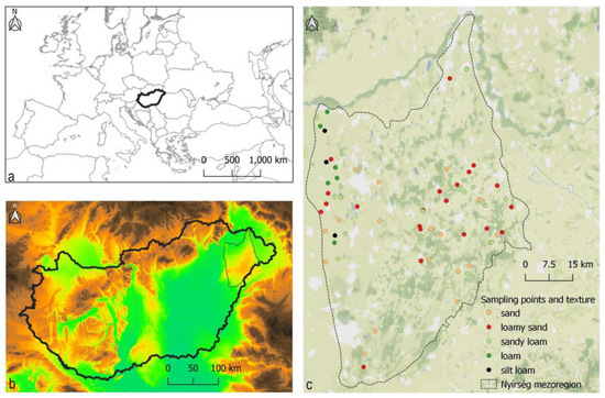 Location of the study area in Europe (a), in Hungary (b), and in the Nyírség mesoregion with sampling sites (c) (used background sources are: b: EU-DEM indicating the terrain heights, and c: Stamen Terrain–Open Street Map showing the settlements with white, arable lands with lighter green, and the forests with dark green).