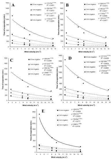 Functional relationships between the time of evaporation (min.) and wind velocity (m s−1) of 5 soil texture categories ((A): sand, (B): loamy sand, (C): sandy loam, (D): loam, and (E): silty loam). Commas in the equations and R2 represent decimal points.