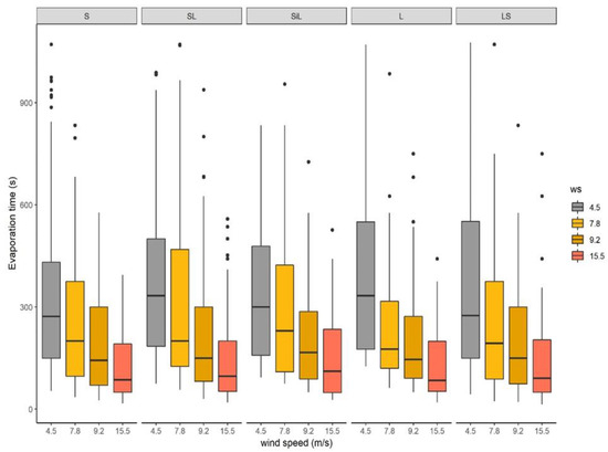 Variation of evaporation time by soil textures at different wind speeds (unit is expressed in the duration needed to evaporate of water amounts). S: sand, SL: sandy loam, SiL: silty loam, L: loam, LS: loamy sand, and ws: wind speed.