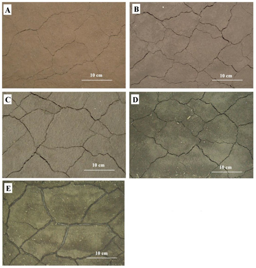 Crusts of various shapes, formed on the surface of soils with different textures after the wind tunnel measurement ((A): sand, (B): loamy sand, (C): sandy loam, (D): loam, and (E): silty loam).