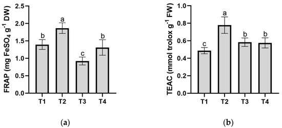 FRAP (a) and TEAC (b) values in spears from the four different plots: untreated control (T1), Brassica pellets (T2), chicken manure pellets (T3), and Dazomet (T4). Values are expressed as means ± standard error (n = 9). Bars marked with different letters indicate significant differences among genotypes based on the LSD0.05 test (p < 0.01).