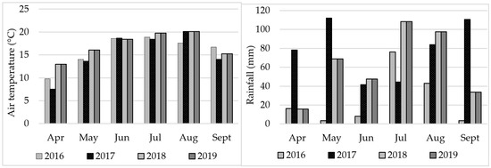 The air temperature and precipitation were measured at the Experimental Station for Cultivar Assessment in Przecław (South-East Poland). Meteorological conditions in the soya bean growing seasons (2016–2019) were evaluated on the basis of monthly precipitation totals, average air temperatures (Figure 1), and Sielianinov’s hydrothermal index (K). The K index, known as the water supply factor for plants, was calculated according to the formula [71]: