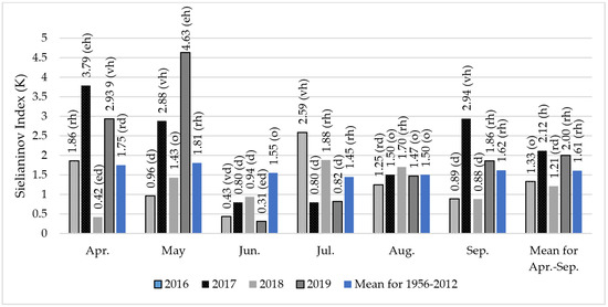 The hydrothermal Sielianinov Index (K) during the growing season of soyabean (April–September) in 2016–2019: K ≤ 0.4 extremely dry (ed); 0.4 < K ≤ 0.7 very dry (vd); 0.7 < K ≤ 1.0 dry (d); 1.0 < K ≤ 1.3 relatively dry (rd); 1.3 < K ≤ 1.6 optimal (o); 1.6 < K ≤ 2.0 relatively humid (rh); 2.0 < K ≤ 2.5 humid (h); 2.5 < K ≤ 3.0 very humid (vh); K > 3.0 extremely humid (eh).