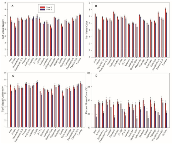 Turf visual quality (A), color (B), uniformity (C) on a scale from 1 to 9 (1 = worst, 9 = best, 6 = minimum acceptable quality), and percent green cover (%) (D) of 20 tall fescue cultivars mowed weekly at 18 mm in Legnaro, PD (Italy). Data are pooled over 12 months and three replicates.