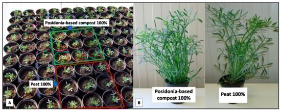 Example of organic renewable materials tested in soilless cultivation: potted sea fennel (Crithmum maritimum L.) grown by using posidonia-based materials as a peat substitute without any negative effect on plant growth in comparison with a commercial peat substrate; sea fennel plants after transplanting (A) and at harvesting time (B) [].