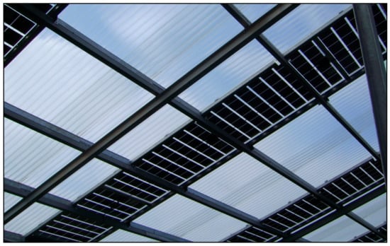 Figure 2. Example of producing solar energy inside the farm: innovative photovoltaic modules used as greenhouse cover material []. - Reducing the use of fresh water (collecting rain water; adopting low-flow water distribution; recirculating water in closed cycle cultivation with filters and UV sanitation; using treated wastewater from urban plants);