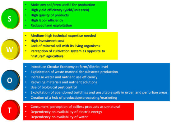 SWOT analysis related to the adoption of soilless systems in horticultural production. S, strengths; W, weaknesses; O, opportunities; T, threats.