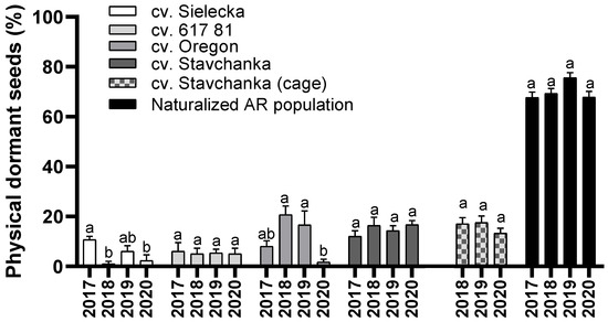 HV shows the capacity to form spontaneous populations in ruderal habitats of cultivated areas [4,5]. Argentinian HV was used as forage and escaped from cultivation a century ago and formed naturalized populations [6]. The ability of HV seeds to have physical dormancy (PY) results in soil seed bank formation and pod dehiscence, which are two important factors that influence natural population dynamics and persistence [7,8]. In HV, the acquisition of PY is initiated when the moisture content of the seeds is ≤14% [9,10]. At seed dispersal, the proportion of seeds with PY was 74% on average in the naturalized AR population [11,12]. Despite the effect of the environment, seed dormancy is largely genetically determined and is variable among genotypes, and this is used in breeding selection [8,13,14,15]. The most important traits for which HV has been selected include biomass production and a low level of seed dormancy [13]. Low PY is a desirable trait for stand establishment [8], while incomplete germination related to PY can result in soil seed bank formation and emergence in subsequent crop rotations as a problematic weed [8,16,17]. On the contrary, in the agroecosystems of semiarid regions, HV’s natural reseeding capacity with high PY is a desirable trait. The adoption of HV is associated with its high self-regeneration potential, which is known in ley farming in Australian systems and helps to reduce production costs, minimalizing the seed and sowing operations [17,18,19,20].