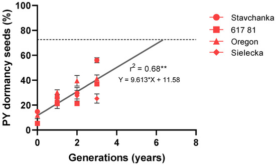 Projection of physically dormant seeds (PY) of EU cultivars (mean and standard error) as a function of generations of spontaneous crosses with a naturalized AR population. (** p < 0.01)