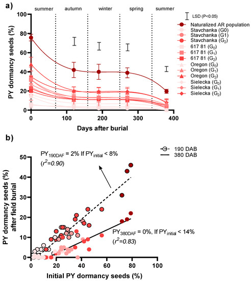 Percentage of physically dormant (PY) seeds for different genotypes and generations of hairy vetch as a function of days after burial (DAB) in field conditions during the 2019 growing season (a), and relation between PY at 190 and 380 days after field burial and initial PY (b).