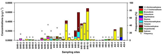 - Liu, Y.; Hao, S.; Zhao, X.; Li, X.; Qiao, X.; Dionysiou, D.D.; Zheng, B. Distribution characteristics and health risk assessment of volatile organic compounds in the groundwater of Lanzhou City, China. Environ. Geochem. Health 2020, 42, 3609–3622. [Google Scholar] [CrossRef] [PubMed]