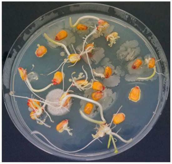 The sprouts test examined the outcome of maize seeds’ enrichment with selected endophytes, in preventing LWD symptoms at the early growth period. The experiment was performed in a growth room (16 h of light, average temperature 25 °C, about 30% humidity). Pots with a volume of 2 L of heavy local peat soil were prepared. The soil was from the Gadash Amir field (Mehogi-1 plot, coordinates: 33°09′59″ N 35°36′52″ E, Hula Valley in Upper Galilee, northern Israel), having a history of pathogen infestations [,]. The soil was mixed with 30% Perlite No. 4 for ground aeration. The inoculation method also consists of sterilized, and M. maydis colonized wheat grains that were used here to disperse the pathogen in the soil, as described previously []. To this end, wheat seeds were allowed to swell for 4 h in tap water, were autoclave-sterilized, and then incubated at 28 ± 1 °C with M. maydis for about 10 days by adding five mycelial discs per bottle containing 50 cm3 of sterilized seeds. The mycelial discs were cut from PDA colony margins, grown as described in Section 2.1.