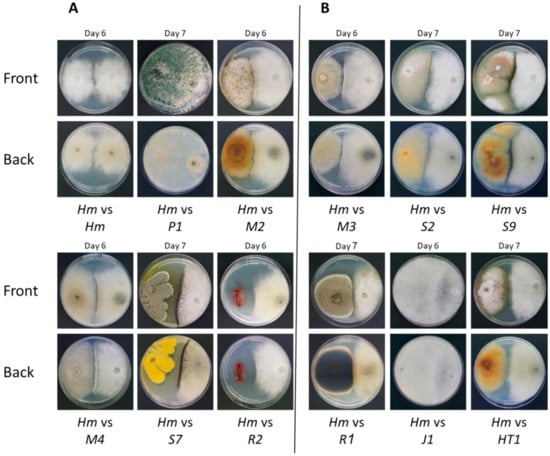 Plate confrontation assays. The PDA plate assay to identify interactions between Magnaporthiopsis maydis and different endophytes. The endophytes species tested are listed in Table 3. Upper left-most panel—M. maydis (Mm) was seeded on both sides of the petri dish. Other panels—the two fungi were planted opposite each other, endophytes species on the left, M. maydis on the right. (A). The endophytes selected for the subsequent sprout pathogenicity assay. (B). Endophytes species not selected for the sprouts assay. Each plate was photographed from both sides, front (upper panel) and rear (lower panel). Images were taken at 6–7 days of growth at 28 ± 1 °C in the dark as detailed above each figure.