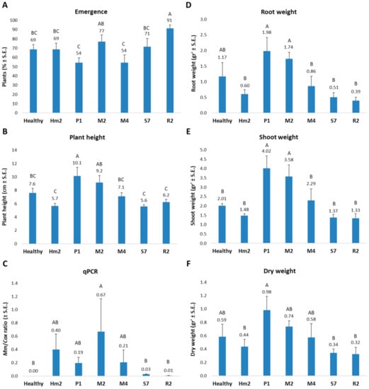 Seedlings pathogenicity assay. Symptoms evaluation was made for the maize late wilt-sensitive Prelude cv. after growing in soil infected with M. maydis in a growth chamber. The seeds were incubated with selected endophytes (Table 3) for two days under moderate humidity conditions prior to sowing. The control seeds underwent similar incubation without endophytes. The emergence percentage of the plants above the ground surface (A) was determined eight days after sowing. All other values (B–F) were documented after 42 days. The quantitative real-time PCR (qPCR) molecular method’s values (C) are M. maydis relative DNA (Mm) abundance normalized to the cytochrome C oxidase (Cox) DNA. The experiment was performed in five repetitions. Error lines represent a standard error. Statistically significant (one-way ANOVA, p < 0.05) difference between the treatments is indicated by different letters (A–C).