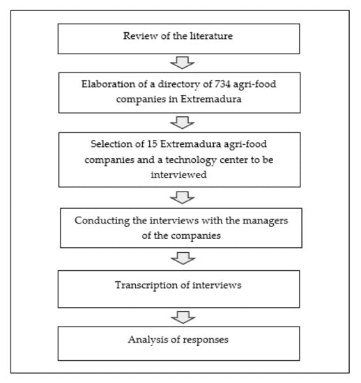 Based on this information, the companies contacted to carry out the study were selected. The selection was established based on various criteria such as belonging to branches of activity that develop or produce highly specialized products in the region (e.g., tomato, oil or wine); different sizes and legal forms (e.g., agri-food cooperatives that have great importance in the sector) and are dynamic and innovative organizations. In-depth interviews were conducted with the managers of 15 Extremadura agri-food companies and a technology center with an important weight in the region.