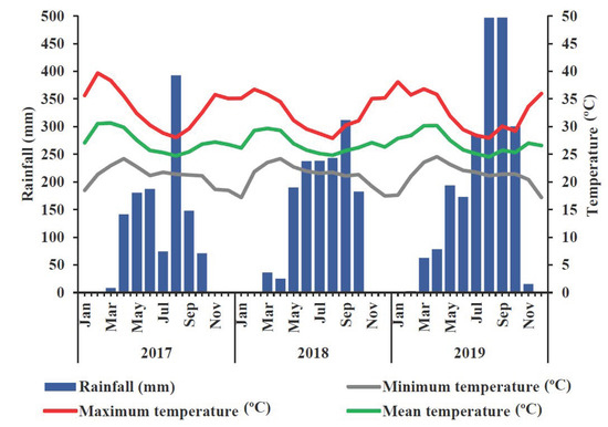 Rainfall and temperature during the cropping seasons from 2017 to 2019 at International Institute of Tropical Agriculture Station, Abuja, Nigeria.