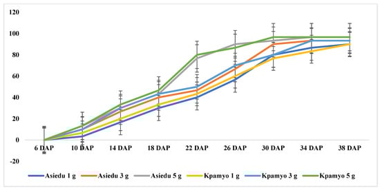 The planted minitubers started emerging from the soil within the first week of planting, although the mean number of days to emergence differed with size. Figure 3 shows the days to emergence, with the 5 g minitubers of Kpamyo and Asiedu being the earliest and were significantly different from the 1 g minitubers of both varieties. Although the increase in the proportion of emerged plants from 1 g and 3 g minitubers was gradual and reached a peak in 38 and 34 days, respectively, that of 5 g was much faster between 18 and 30 days, when Kpamyo peaked at 96.7%. The 1 and 3 g minitubers were similar in their time to emergence (Figure 3). The period to 50% of the plant’s emergence from the soil from 5 g minitubers was considerably earlier (p = ≤0.05) than plants from 1 and 3 g minitubers (Table 1). There was generally no difference between the yam varieties regarding the time to 50% emergence and final crop establishment (Table 1, Figure 3).