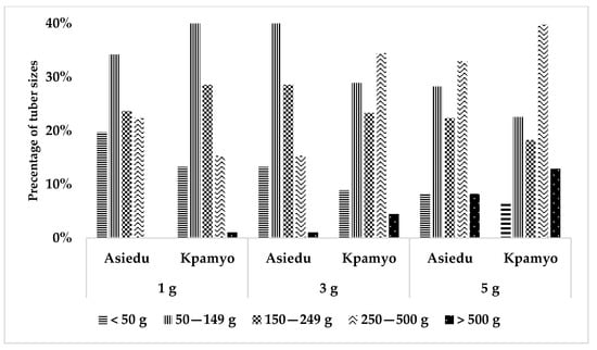 At harvest, the tubers were sorted out into four categories (Figure 4). It was observed that 5 g minitubers of Kpamyo produced 18% and 40% of seed tubers in the range of 150 to 249 g and 250 to 500 g, respectively, while the 5 g minitubers of Asiedu produced 22% and 32% of these seed tuber sizes, respectively. The 1 g minitubers of both varieties and 3 g minitubers of Asiedu produced the most proportion of tubers in the category of <50–249 g, while the bigger minitubers produced more seed of more than 500 g. The 1 g minitubers of Asiedu did not have any tuber bigger than 500 g.