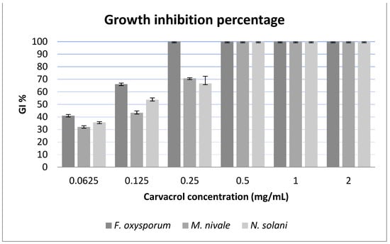 The antifungal activity results obtained showed that all fungal species were very sensitive to carvacrol since the MIC value of carvacrol vs. F. oxysporum was 0.25 mg/mL and 0.5 mg/mL for both M. nivale and N. solani. Regarding growth inhibition percentage (GI%) of radial mycelium, the results obtained seem to show that the percentage of growth inhibition was linearly correlated to carvacrol dose up, which reached 100% at 0.5 mg/mL against all strains tested. With lower concentrations than MIC, carvacrol slightly controlled the growth of strains (Figure 2). The growth inhibition of F. oxysporum, M. nivale, and N. solani differed statistically between the different doses of carvacrol used, and the concentrations of carvacrol were statistically more efficient on F. oxysporum (See post hoc test in Table 7).