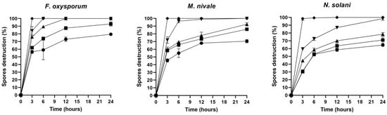 The results of the sporicidal effects of carvacrol on fungal strains are presented in Figure 3. Carvacrol showed a very strong sporicidal effect vs. all tested Fusarium strains. At a concentration of 0.8 mg/mL, carvacrol destroyed F. oxysporum, M. nivale, and N. solani spores immediately after 6 h, 12 h, and 24 h, respectively. After increasing the concentration (1 mg/mL), all strains’ spores were immediately destroyed after 3 h only.