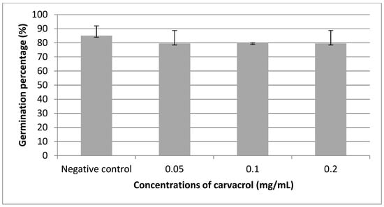 For this, 510 seeds were disinfected with 12° sodium hypochlorite solution for 20 min and then rinsed twice with sterile distilled water for 10 min before being transferred to Petri plates containing sterile layers of filter paper [,]. In this assay, the seeds were divided into 17 groups of 30 seeds (Table 3) and were treated with 1 mL of carvacrol on the first day before being infested. The experiment was carried out for 4 weeks. The percentage of seed germination was measured as reported elsewhere []. Quantitative data were expressed as means of triplicate experiments.