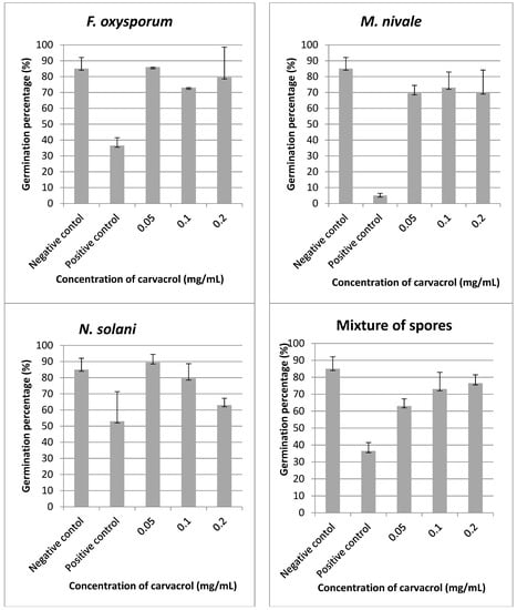The results obtained showed that carvacrol investigated in the present work can meet the requirement for being environmentally friendly argent to control strains spores due to its results in inhibiting this pathogenic strain. The findings obtained showed that carvacrol seriously controlled the tested genera even at low concentrations (MIC values ranged from 0.2 to 0.4 mg/mL). These results are consistent with those previously reported elsewhere [,], which showed that essential oil with natural carvacrol had an inhibitory effect on germination of Fusarium oxysporum f. dianthi spores. As regards the effect of carvacrol against N. solani, the MIC was 0.21 mg/mL. Moreover, earlier works reported closer MIC value For M. nivale treated with essential oils contained carvacrol [,,,]. The difference in MICs can be due to the use of different methods, in particular, the concentration of spore inoculum, effects of incubation temperature, time of reading on broth dilution, the use of detergents or solvents for carvacrol dispersion, which affect the antifungal activity [,]. Methods by which MIC is evaluated (liquid or agar medium), as well as the difference in culturing techniques, cannot be excluded [,].