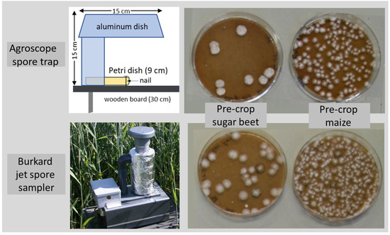 One of the most effective factors to reduce FHB risk is the abandonment of a maize/wheat rotation with reduced tillage, although this has negative impacts on economic profit and soil protection. Therefore, in on-farm experiments, maize residue treatment studies were conducted in grain maize/winter wheat rotations with no-tillage in Switzerland. Compared with samples from fields, where no maize residue treatments were conducted, fine mulching or mulching with the superficial incorporation of maize residues reduced the average DON content in wheat grains between 21 and 38% [10]. To obtain a better understanding of the epidemiology of the Fusarium species, we started to measure deposited airborne ascospores with spore traps in these field trials during wheat anthesis, when the susceptibility of the crop is highest [11].
