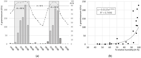 (a) Fusarium graminearum colony-forming units (CFUs in bars) sampled in 2-hour periods with an AGS spore trap at 50 cm in the wheat field C (Table 1) from June 17 (14:00) until 19 June (14:00) 2008. The dotted line indicates the corresponding relative humidity (rh%) measured at 2 m and the grey areas highlight the periods with a relative humidity of 90–100%. (b) Relationship between the relative humidity and F. graminearum CFUs (black circles). The relationship is best described with the exponential function with an r2 = 0.750.