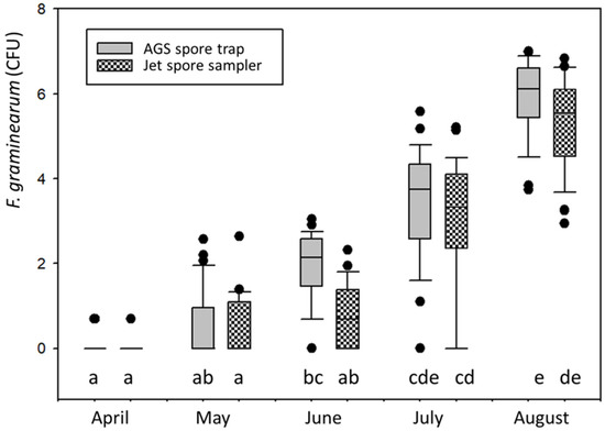 Box plots of Fusarium graminearum colony-forming units (CFU) sampled in field A (Table 1) from 1 April until 31 August with an AGS spore trap (grey) or a high-throughput jet spore sampler (chequered). Same letters below the boxes indicate that the CFU data from the 2 spore trap types were not significantly different according to a Kruskal-Wallis one-way analysis of variance on ranks followed by a Dunn’s test. For the figure, ln(x + 1) transformed CFU data were used.