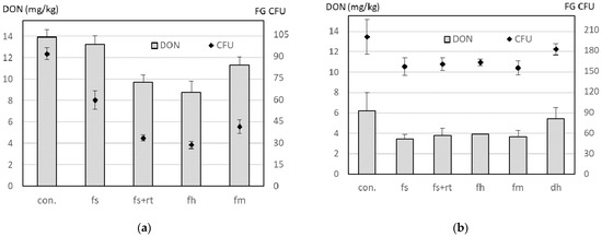 In the experiment of 2007, spore sampling was conducted only once on 5 June during wheat anthesis. Just 2 days later, FusaProg [19] indicated a day of high infection risk and in the following 15 days, 8 days with high and 3 days with low risk. This high-risk situation can explain the high DON content of up to 13.9 mg/kg measured in the wheat grains (Figure 5a). The effect of the residue treatments on the FG CFU and the DON content revealed a strong correlation coefficient of 0.808 (p < 0.001) (Table 4).