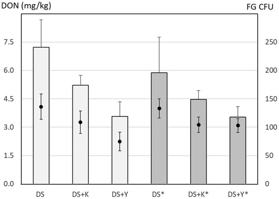 Apart from the strong correlation between the spore deposition and the DON contamination in wheat, the current study has shown that the spore deposition identifies the epidemiological value of a particular treatment. Recently, applications of C. rosea on wheat heads reduced DON by 45–69% but showed no effect on zearalenone (ZEN) [34]. With applications on maize residues, and thereby taking the epidemiology of F. graminearum into account, both DON and ZEN in wheat were reduced by 80–90% [33].