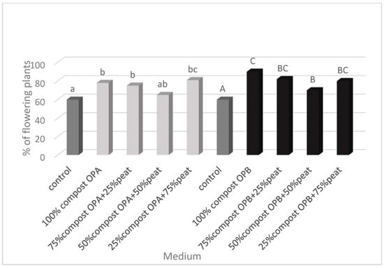 Percentage of flowering plants depending on the medium. Means followed by the same letters do not differ significantly at p = 0.05.