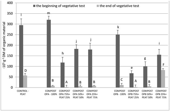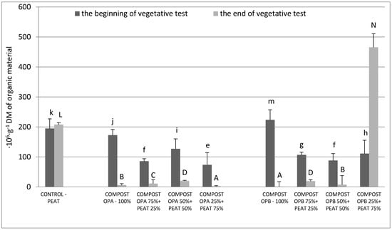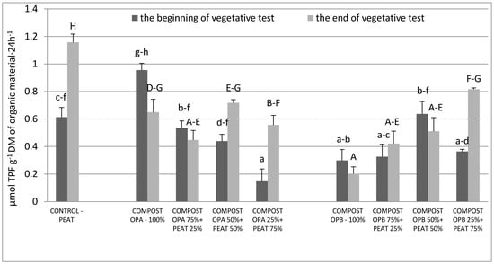 The acid phosphatase level in all the treatments (Figure 6) was higher at the beginning of the experiment than at the end. This may have been caused by a decrease in the content of decomposing organic phosphorus compounds. At the end of the experiment, there were statistically significant changes in the treatments with both the OPA and OPB compost (100% or 75% of the substrate).