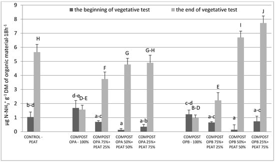 Soil urease (EC 3.5.1.5) activity (URE) was assayed as described by Hoffmann et al. []. Briefly, 1 g of moist compost/peat was incubated with 0.15 mL of toluene for 15 min at room temperature. Next, 1 mL of the urea solution was added to the compost/peat samples and incubated for 18 h at a temperature of 37 °C. After the incubation, 5 mL of 0.03 M acetic acid was added and shaken for 20 min. Next, the samples were drained through paper filters (90 mm, Munktell Ahlstrom firm). 0.4 mL of 25% sodium potassium tartrate, 18 mL of distilled water and 0.4 mL of Nessler’s reagent were added. The wavelength urease activity was 410 nm and it was expressed as μg N-NH4 g−1 DM of compost/peat 18 h−1.