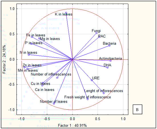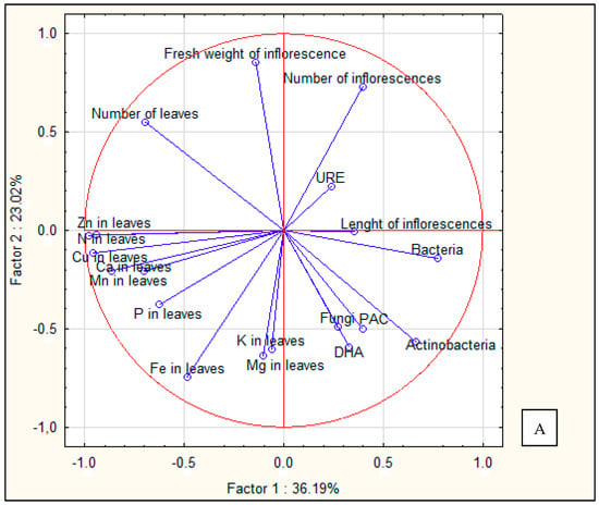 The principal component analysis showed that the dependencies between the parameters under analysis were related to the composition of the compost. In the treatments with the OPA compost, there was a strict, positive relation between the count of actinobacteria and bacteria. There was no relation between the growth and development of bacteria and moulds. However, in the treatments with the OPB compost, there was a relationship between all the groups of microorganisms under analysis. Apart from that, the research results showed that when the OPA compost was used, the dehydrogenase activity level was influenced only by actinobacteria, whereas the alkaline phosphatase activity was mostly affected by moulds and secondly by actinobacteria. The research did not reveal a positive relationship between the urease activity and the count of the groups of microorganisms under analysis. There were slightly different relations between the test parameters in the substrates with the OPB compost. The DHA and URE levels were positively correlated with the growth and development of bacteria and actinobacteria, whereas the PAC level was positively correlated with the count of all groups of microorganisms. The principal component analysis also showed that when the crops were grown on the substrates containing both variants of compost, the number of leaves, the fresh weight of inflorescence and the content of N, Fe, Ca, Zn, Mn and Cu in the leaves were negatively correlated with the count of bacteria and actinobacteria. This might be evidence that microorganisms competed with the plants for nutrients in the substrate.